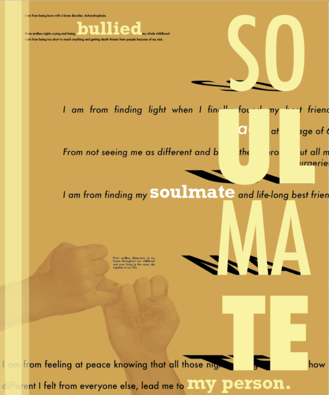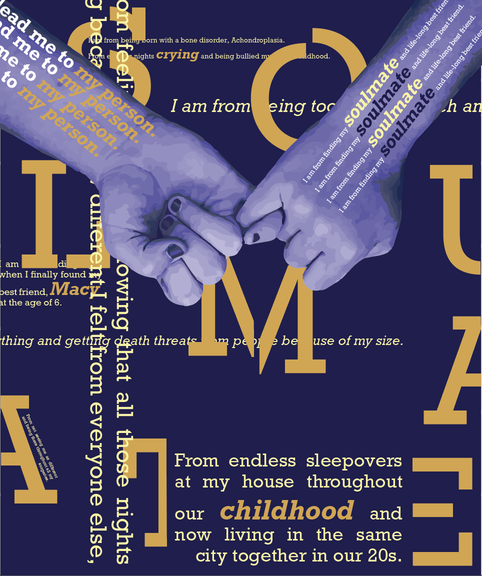A challenge that I faced was designing the first set of posters in Illustrator. Although my thumbnails helped tremendously, it was tricky to work with hierarchy, placement, and spacing between the stanzas . After many critiques, I was able to redesign it and make all the posters tell a story and work cohesively.