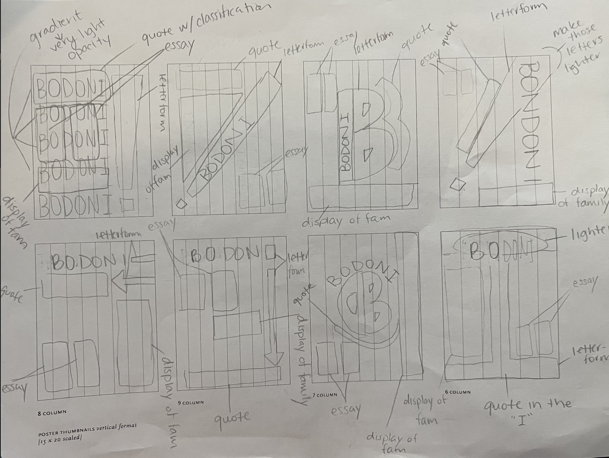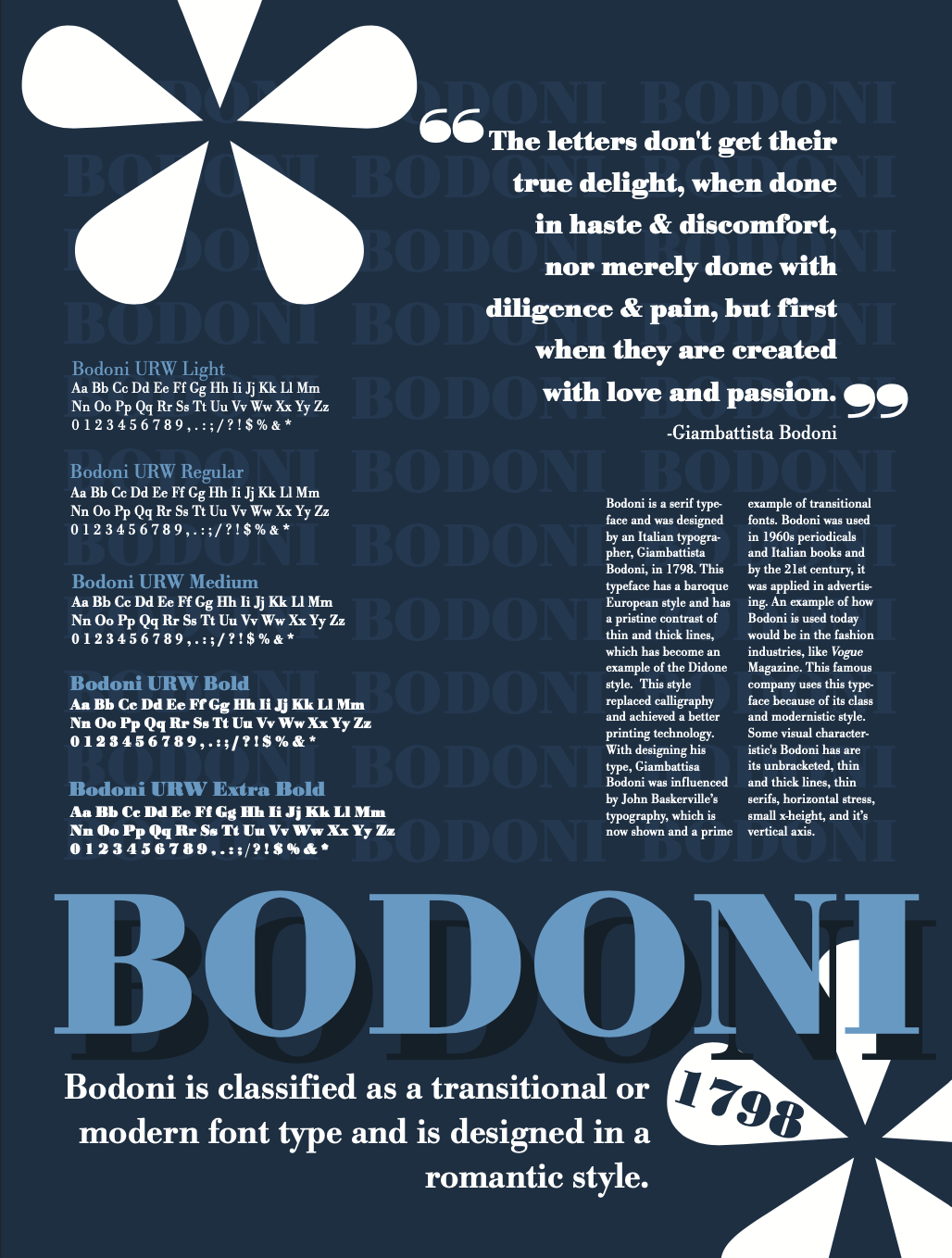The objective of this project was to chose a typeface and build a poster series from it. Since I can remember I've been collecting Vogue magazines, so I decided to work with the typeface Bodoni. I love Bodoni's modern style and its prominent characteristics of thin and thick lines in the font. I designed two 15x20-inch Type Specimen Posters in Adobe Illustrator and then limited it down to one. Then I designed a companion piece in another 15x20-inch poster featuring a timeline contextualizing my chosen typeface. For my color palette, I chose different shades of blue because it's calming and inviting. Both posters follow a grid and have hierarchy.